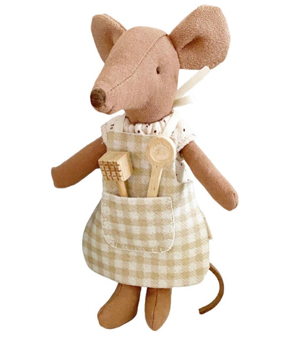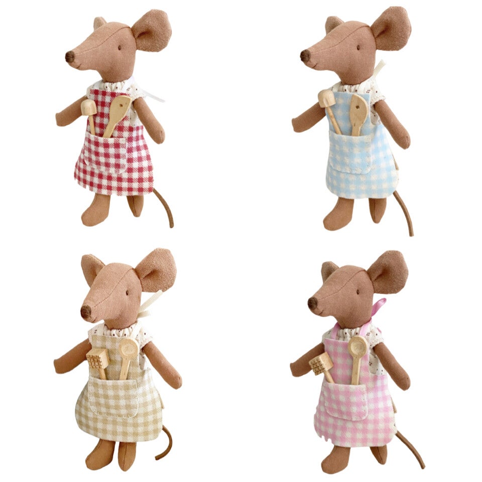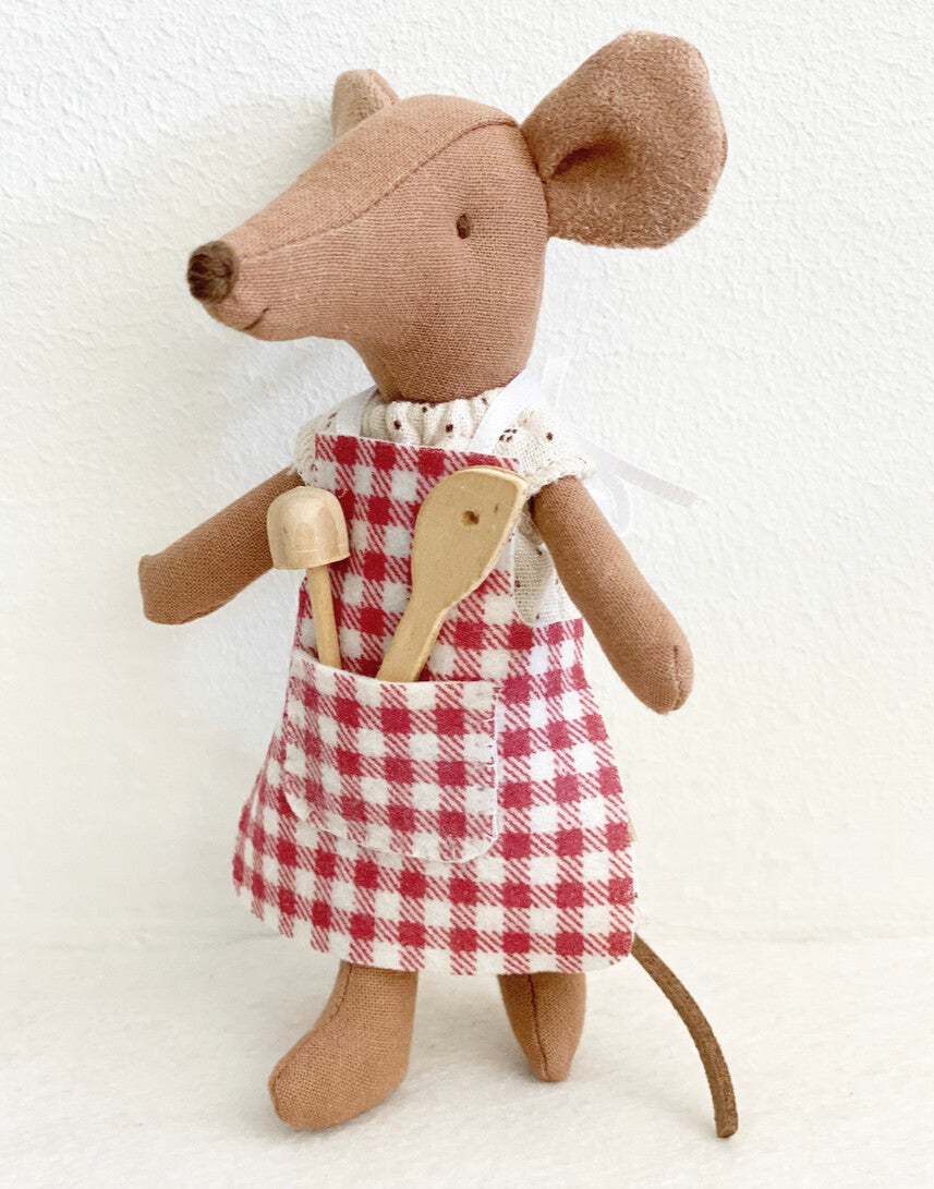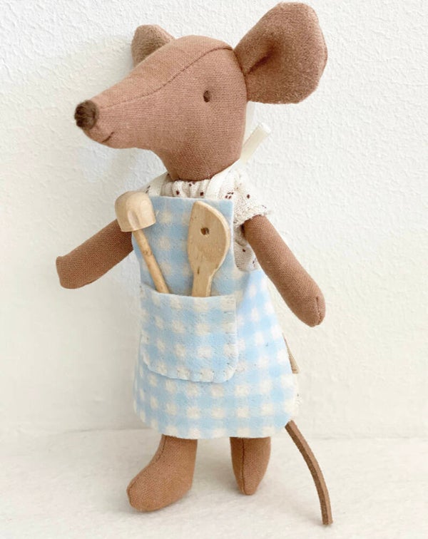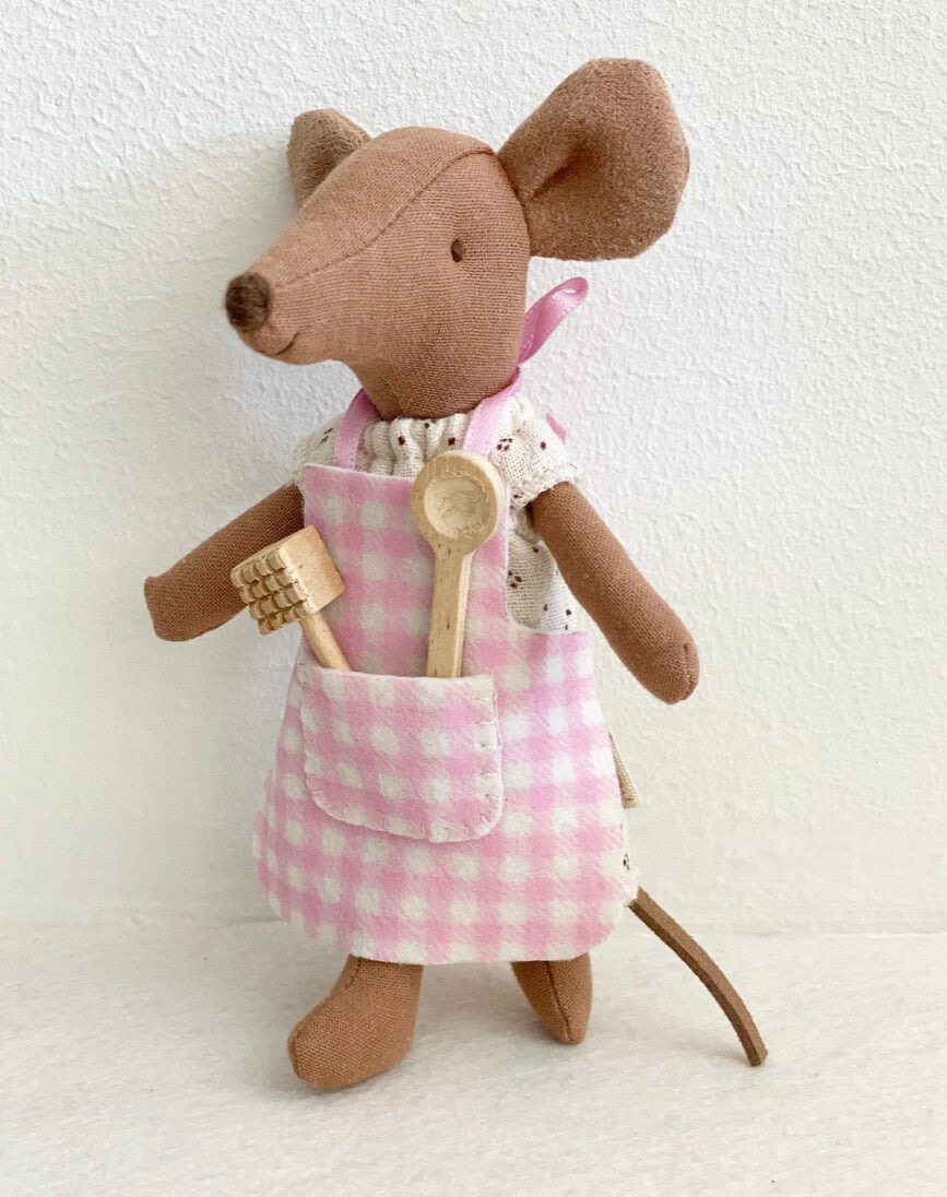 Handgemaakt keuken schortje voor de Maileg muisjes. Past de big sister en big brother muisjes. Het schortje heeft lintjes aan de achterzijde die je kunt strikken zodat het schortje goed blijft zitten. Aan de voorzijde voorzien van een steekzak waarin twee houten keuken benodigdheden zitten. Het schortje is verkrijgbaar in vier kleuren.
