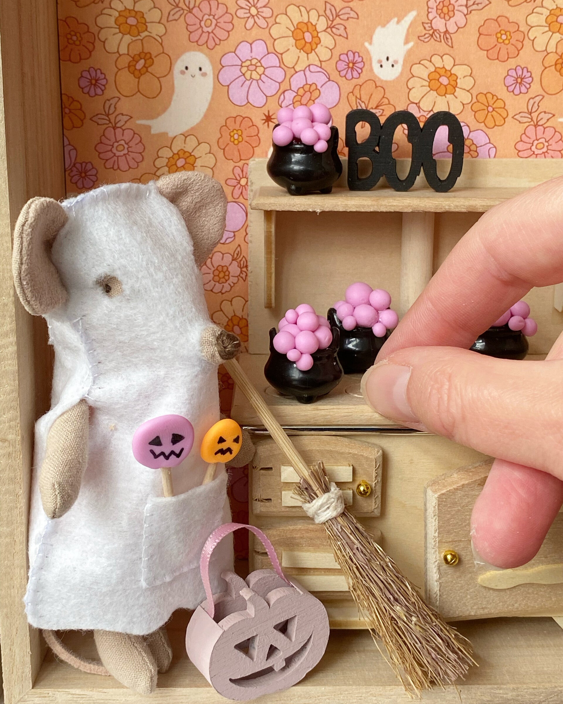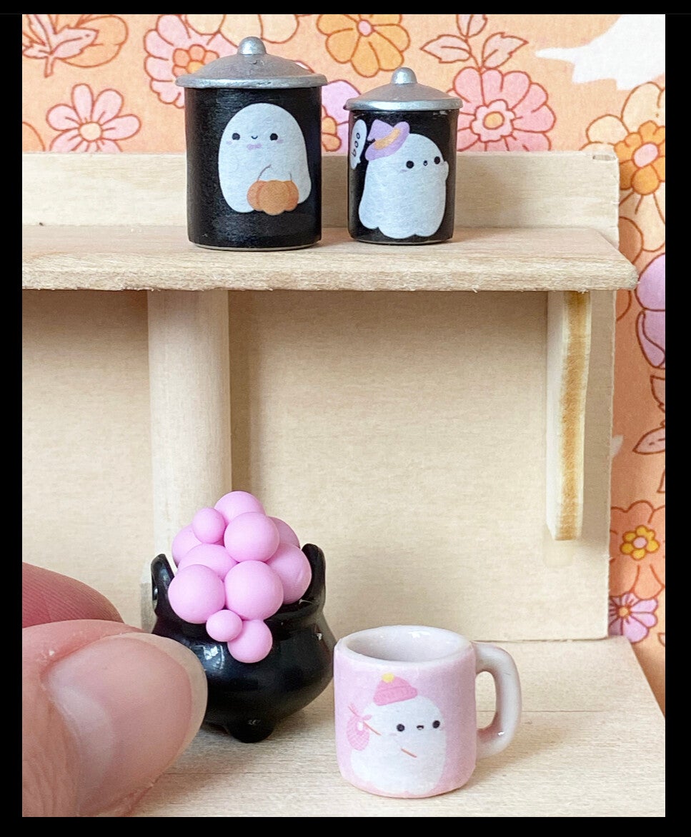 Kleine zwarte ketel met een tover brouwsel erin. Leuk ter decoratie in een sprookjes thema of voor Halloween. Materiaal: kunststof en fimo. schaal 1:12.
