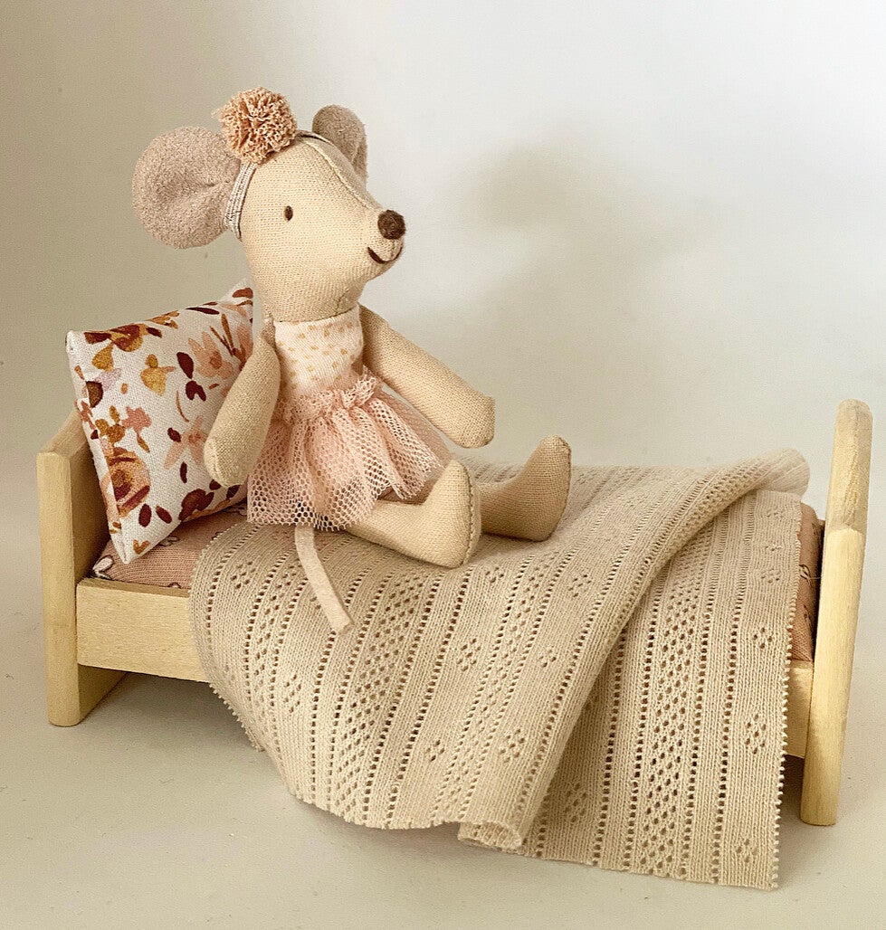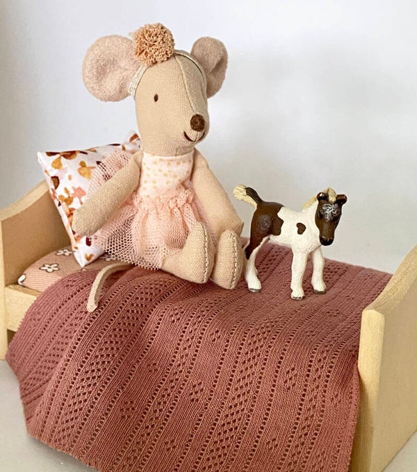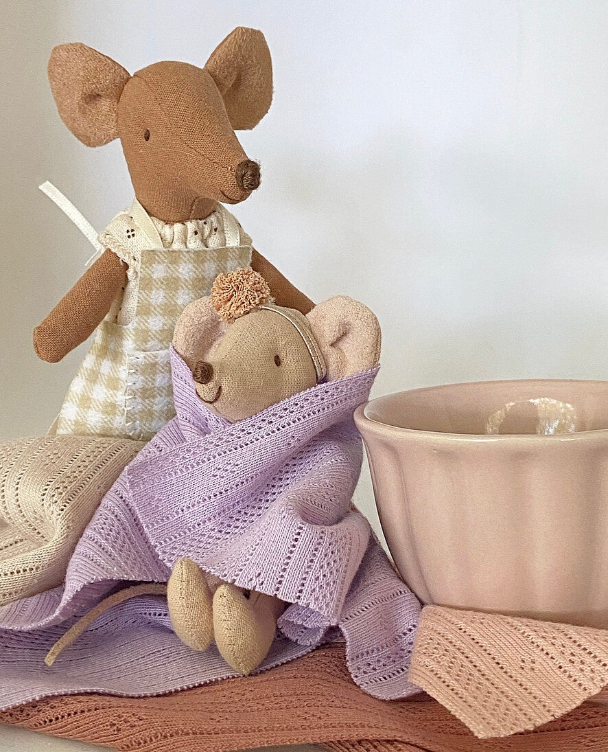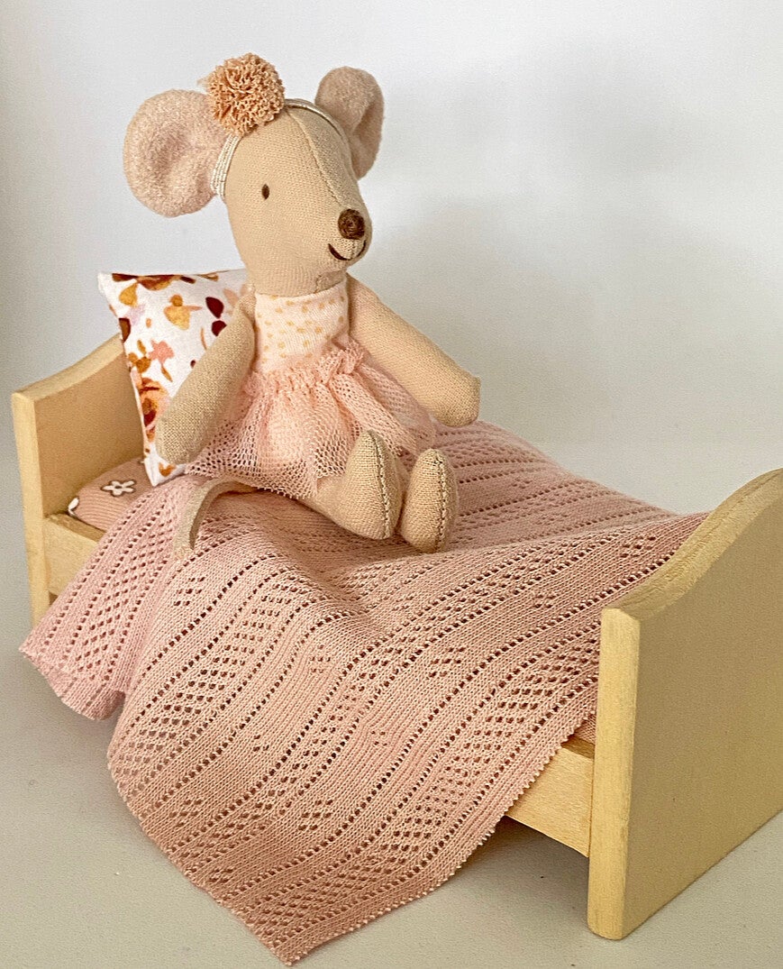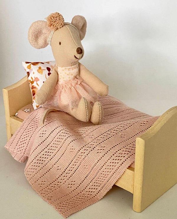 Mooie soepel vallende deken van tricot met ajour print. Verkrijgbaar in 4 kleuren. Niet alleen leuk voor op je poppenhuis bedje maar ook heel mooi als plaid op een stoel of bank. Afmetingen zijn 14 x 16cm.