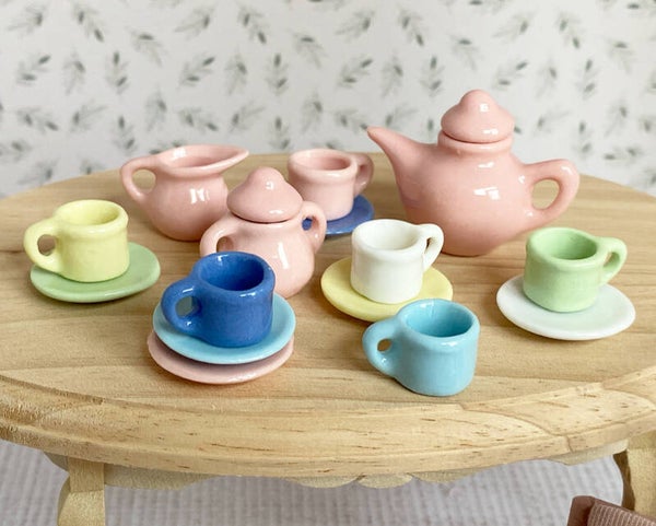 Dit schattige theeservies in pastelkleuren is gemaakt van porselein. Hij bestaat uit een theepot, suikerpot, melk kannetje, 6 kopjes en 6 schoteltjes. Heel leuk om onderling te mixen of matchen. Qua afmetingen perfect voor de Maileg muisjes.