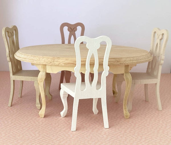 Deze mooie set bestaat uit een blank houten eettafel en vier stoelen. De stoelen hebben allemaal een ander poeder pastelkleurtje. De micro Maileg muisjes passen er perfect bij.