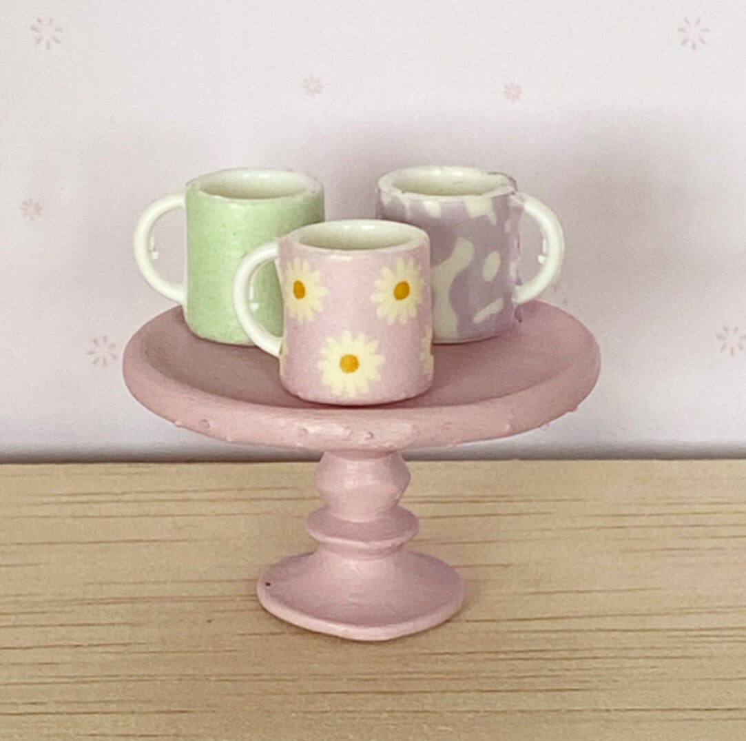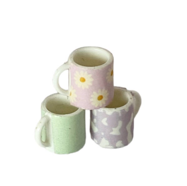 Lieve set van drie mokjes. Bestaande uit een lila mokje met witte vlekjes, een effen mint mokje en een roze mokje met bloemetjes. Materiaal: kunststof. Schaal 1:12.
