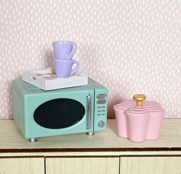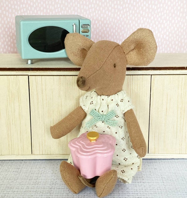 Hoe schattig is deze roze pan in de vorm van een bloem. Met goudkleurige knop en gemaakt van metaal. Hij is wat groter dan de standaard 1:12 verhouding en daarmee perfect voor bij de Maileg micro muisjes of in het wat grotere poppenhuis.