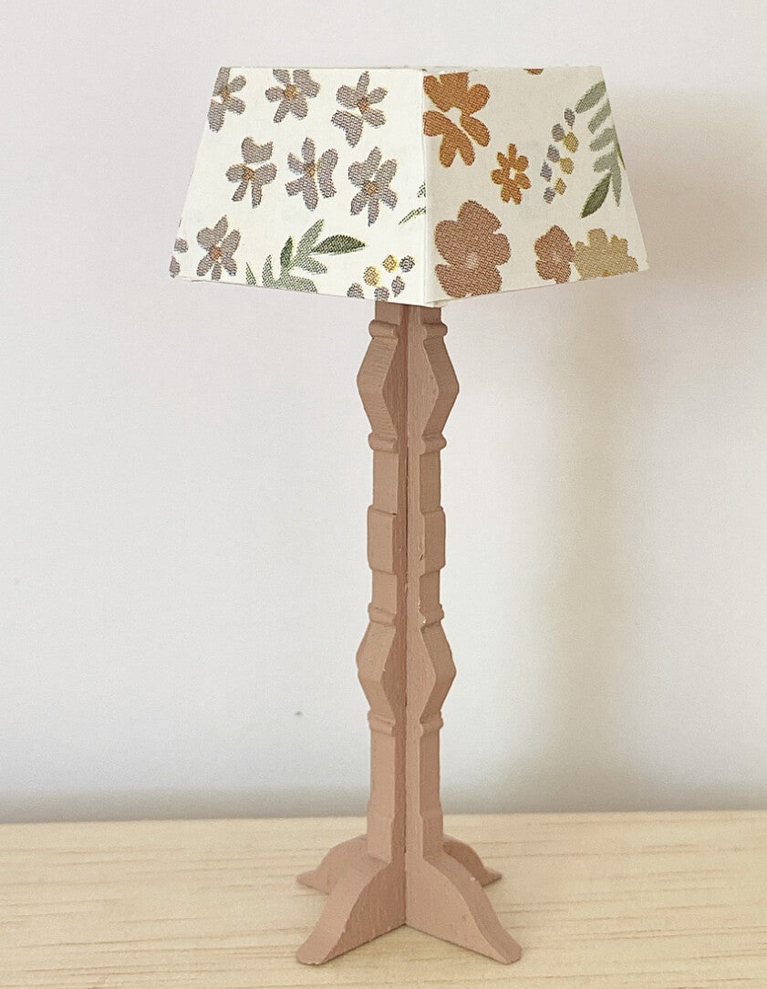 Hoe leuk is deze schattige lamp. Hij heeft een kap met bloemenprint en afhankelijk van de grootte van je poppenhuis kun je hem als tafellamp of staande lamp gebruiken. Let op: De lamp kan niet echt aan.
