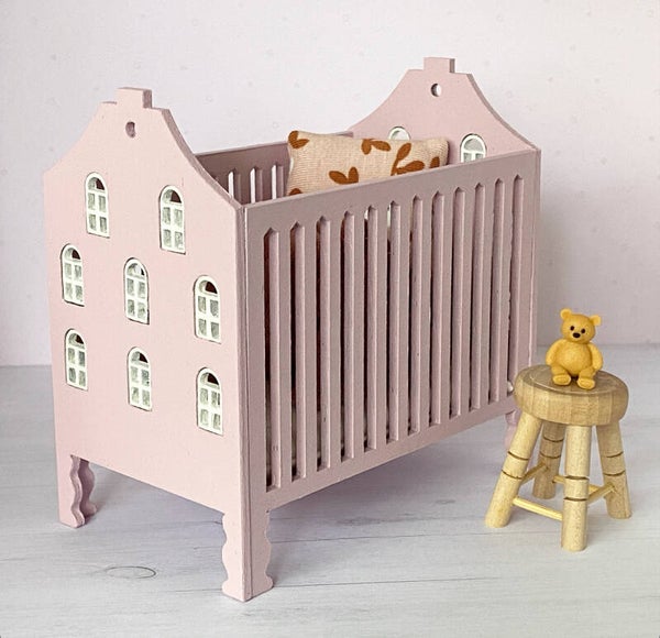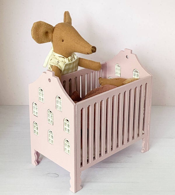 Ledikantje met als hoofd en voeteneind een schattig grachtenpandje. Ik ben heel blij dat in samenwerking met Littly By Nina dit ledikantje nu in mijn webshop verkrijgbaar is. Het is geverfd in een zachtroze kleur en komt met een wit matrasje. Dekentjes en kussens zijn apart verkrijgbaar in de webshop. De Maileg baby en kleine zus/broer muisjes passen perfect in het ledikantje.
