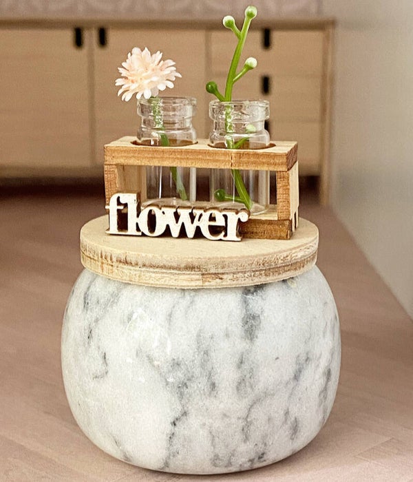 Kleine houten houder met twee glazen vaasjes erin. Gevuld met een schattig bloemetje en takje zoals op de foto. De kleuren van het bloemetje kunnen licht afwijken van de foto.