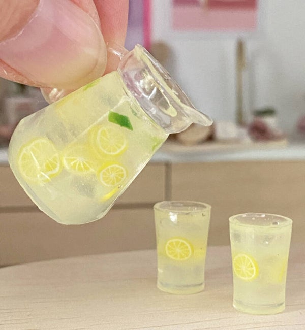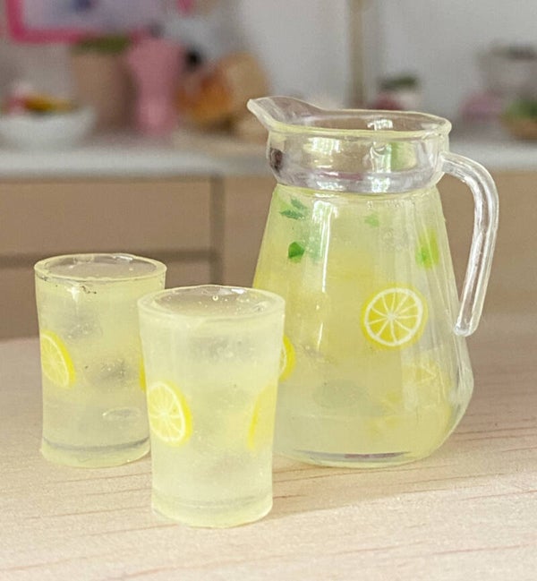 Echt een hele mooie transparante kan met twee bijpassende glazen. Gevuld met citroen limonade. Gemaakt van kunststof.