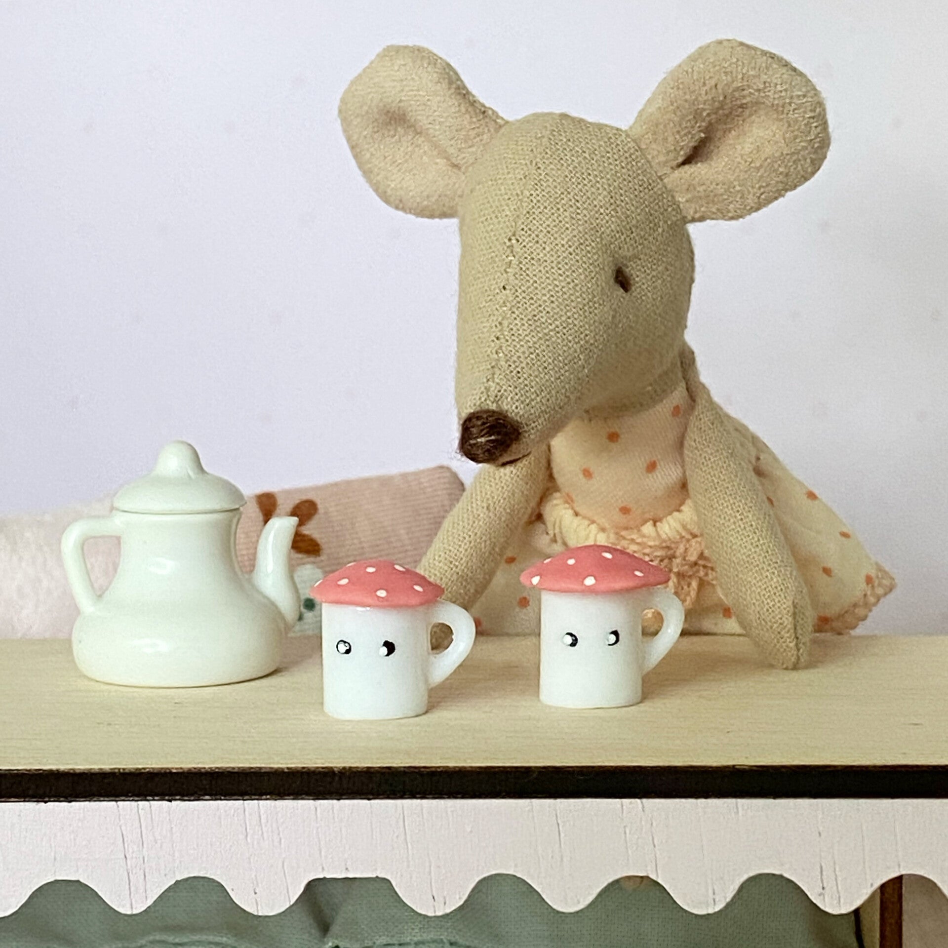 Kleine witte mok met een roze paddenstoel hoedje. Het hoedje kan er af. De mokjes zijn per stuk verkrijgbaar en kunnen onderling iets van elkaar verschillen omdat het handgemaakt is.