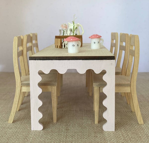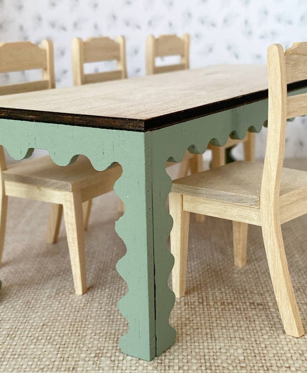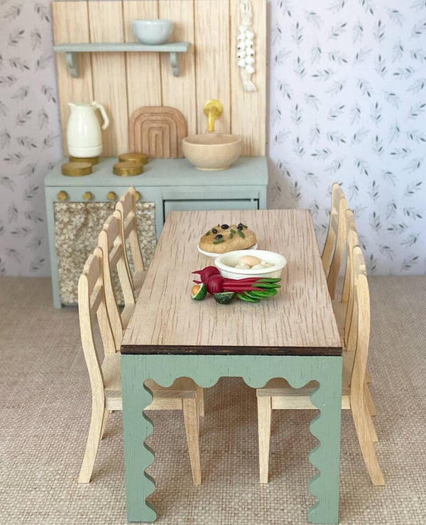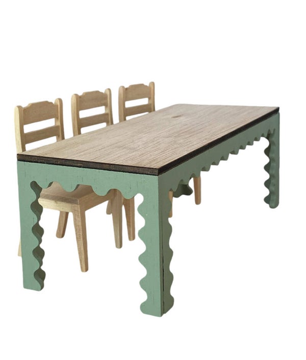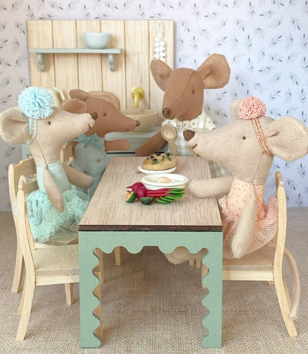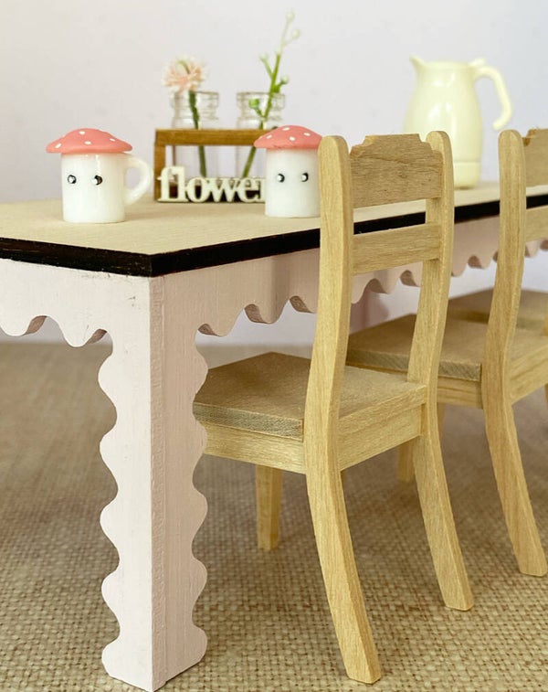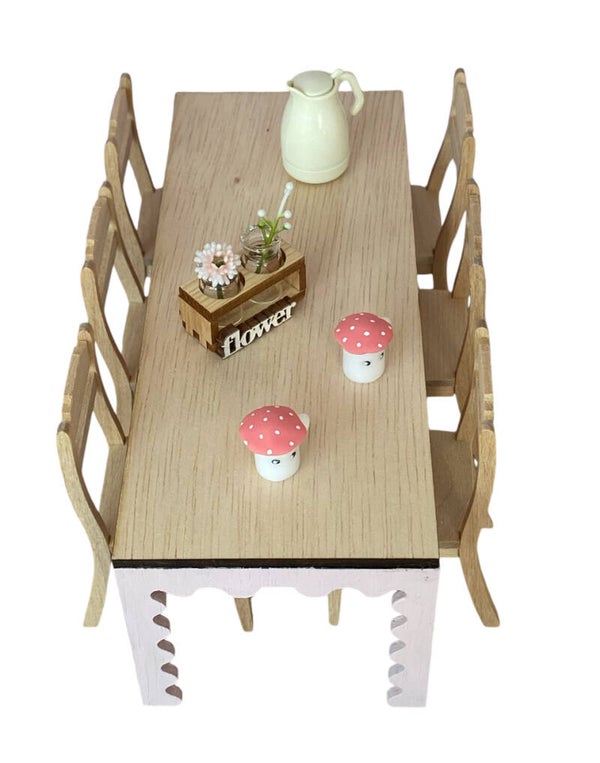 Een extra lange eettafel met mooie geschulpte rand en poten in een lieve pastel kleur. De tafel biedt plaats aan maar liefst 6 stoelen. Zo is er genoeg plek voor al je poppenhuis bewoners. De stoelen kun je er los bijkopen. Wanneer je een complete set (tafel met 6 stoelen) koopt is dat voordeliger.