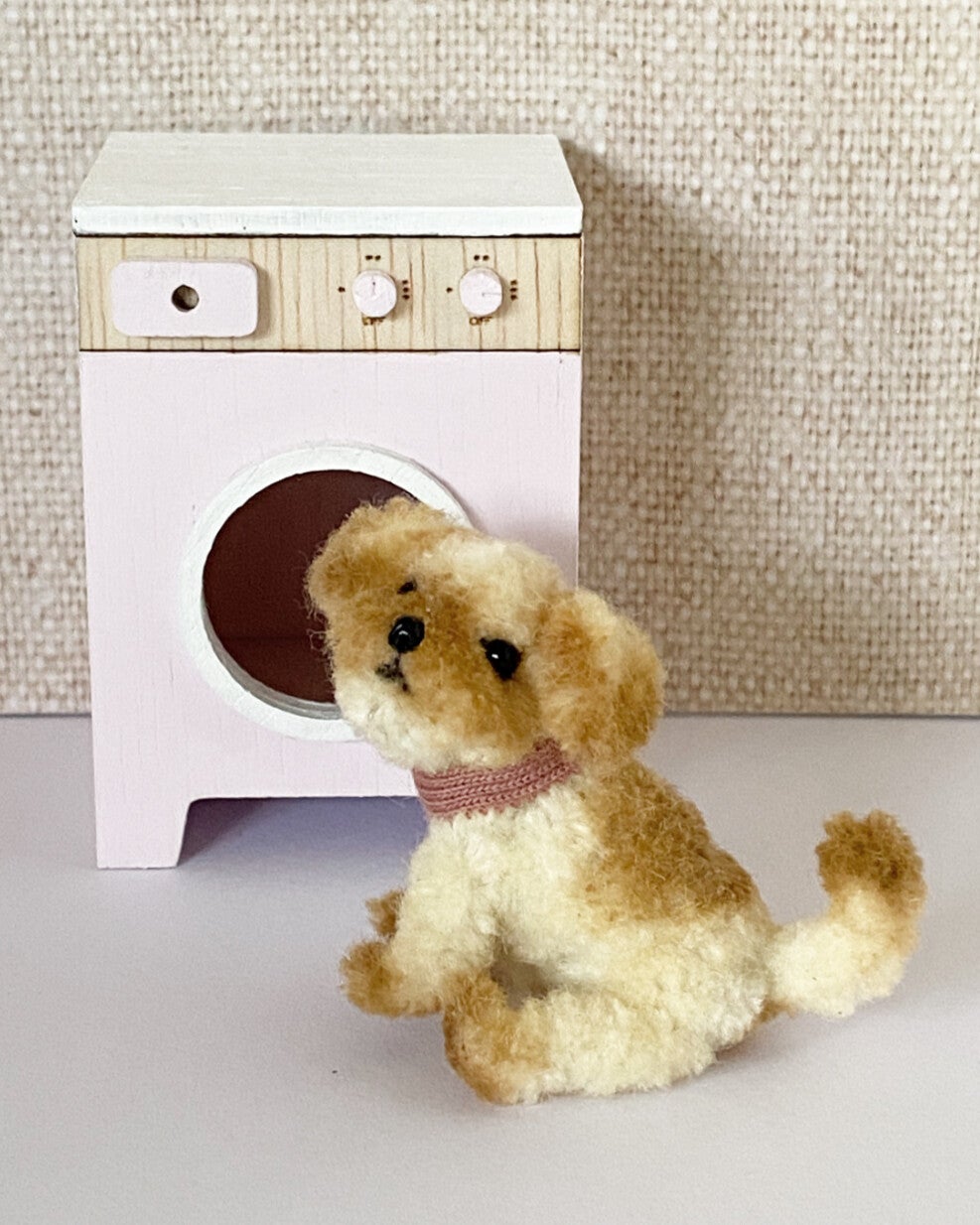 Dit lieve kleine hondje is handgemaakt door mij. Je kunt hem voorzichtig in verschillende posities laten staan of zitten. Echt heel schattig om zo'n klein vriendje in je poppenhuis te zetten. Qua afmetingen past het hondje heel goed bij de kleine Maileg muisjes. Hondenmandjes zijn apart verkrijgbaar.