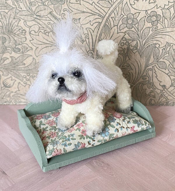 Dit lieve kleine hondje is handgemaakt door mij. Je kunt hem voorzichtig in verschillende posities laten staan of zitten. Echt heel schattig om zo'n klein vriendje in je poppenhuis te zetten. Qua afmetingen past het hondje heel goed bij de kleine Maileg muisjes. Hondenmandjes zijn apart verkrijgbaar.