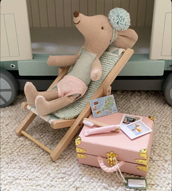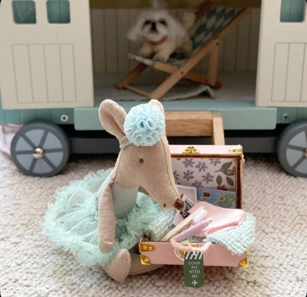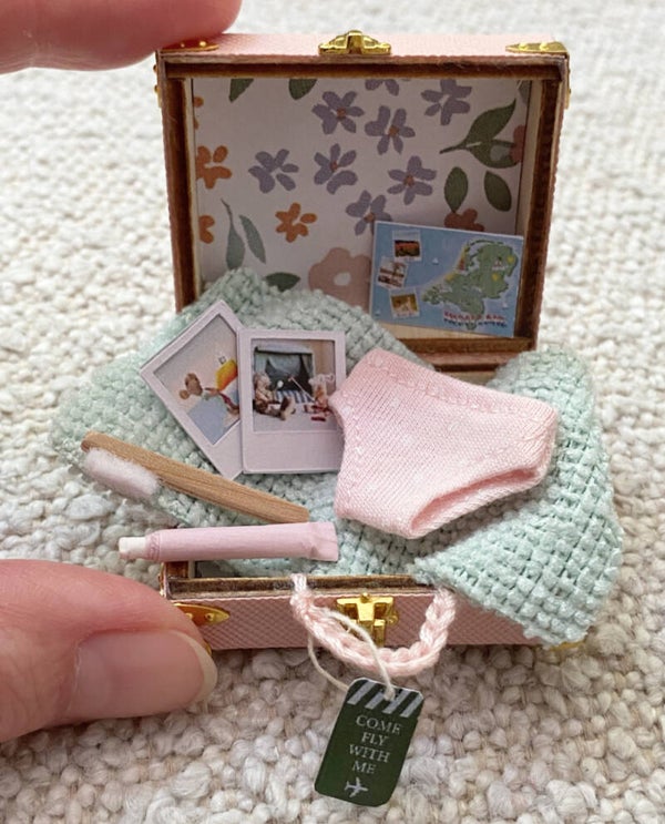 Hoe lief is deze kleine roze vakantie koffer met inhoud. Kleine muis kan er nu gerust op uit. De label en plaatjes om op de koffer te plakken komen er los bij. Zo kun je zelf bepalen of je deze erop doet of de koffer liever zo laat.
