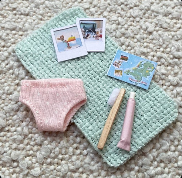 Compleet met inhoud: 1 onderbroek, 1tandenborstel, 1 tube tandpasta, 1 ansichtkaart, 2 vakantie foto's en een handdoek.