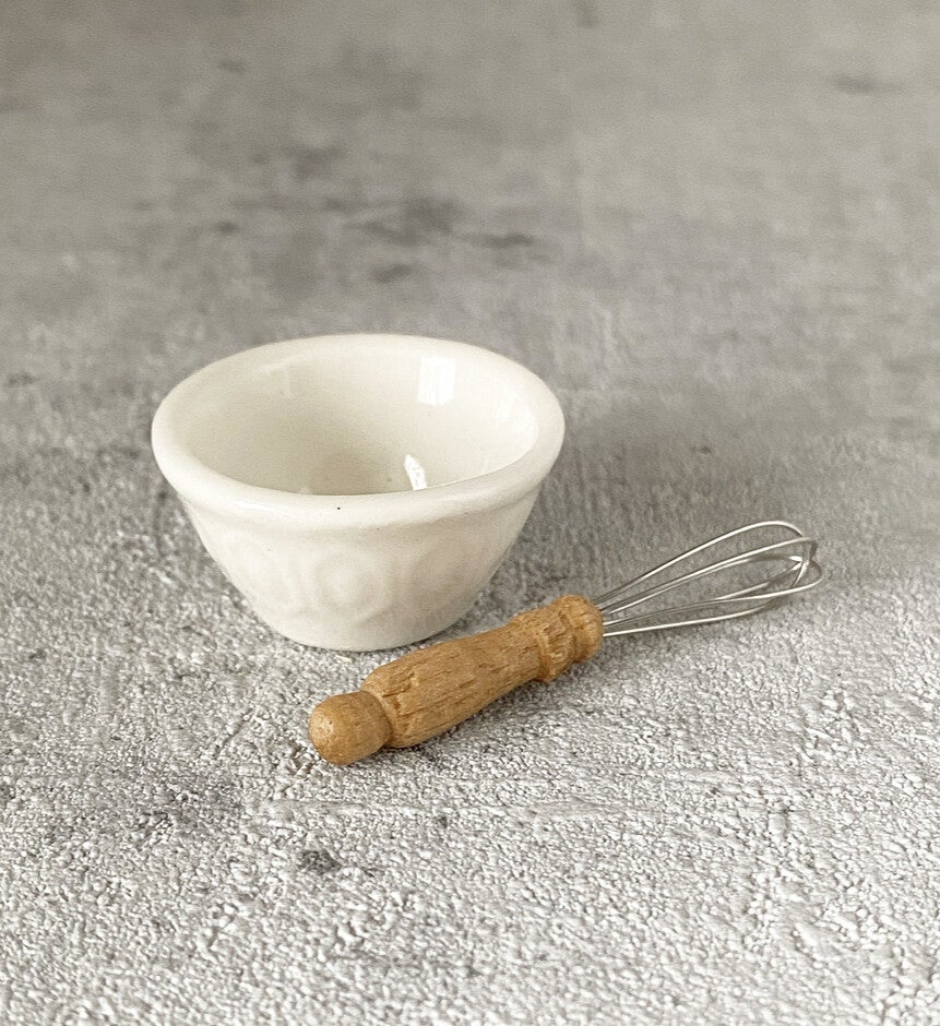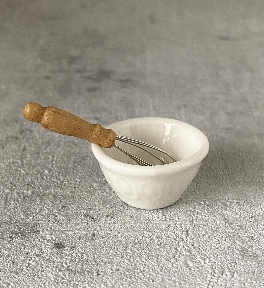 Garde voor in de poppenhuis keuken. Leuk te combineren met de kommen die ook verkrijgbaar zijn in de shop. Het handvat van de garde is van hout. Schaal 1:12