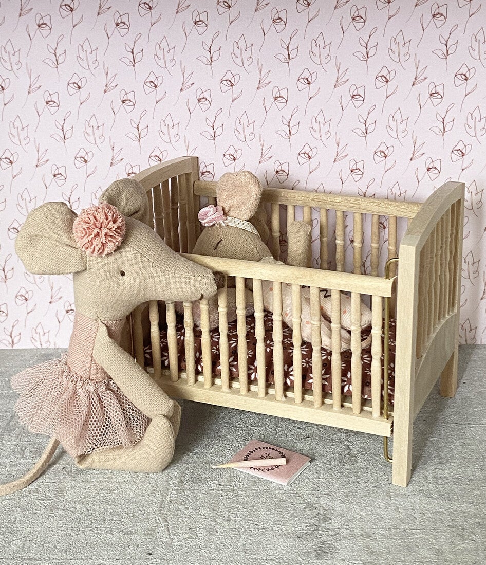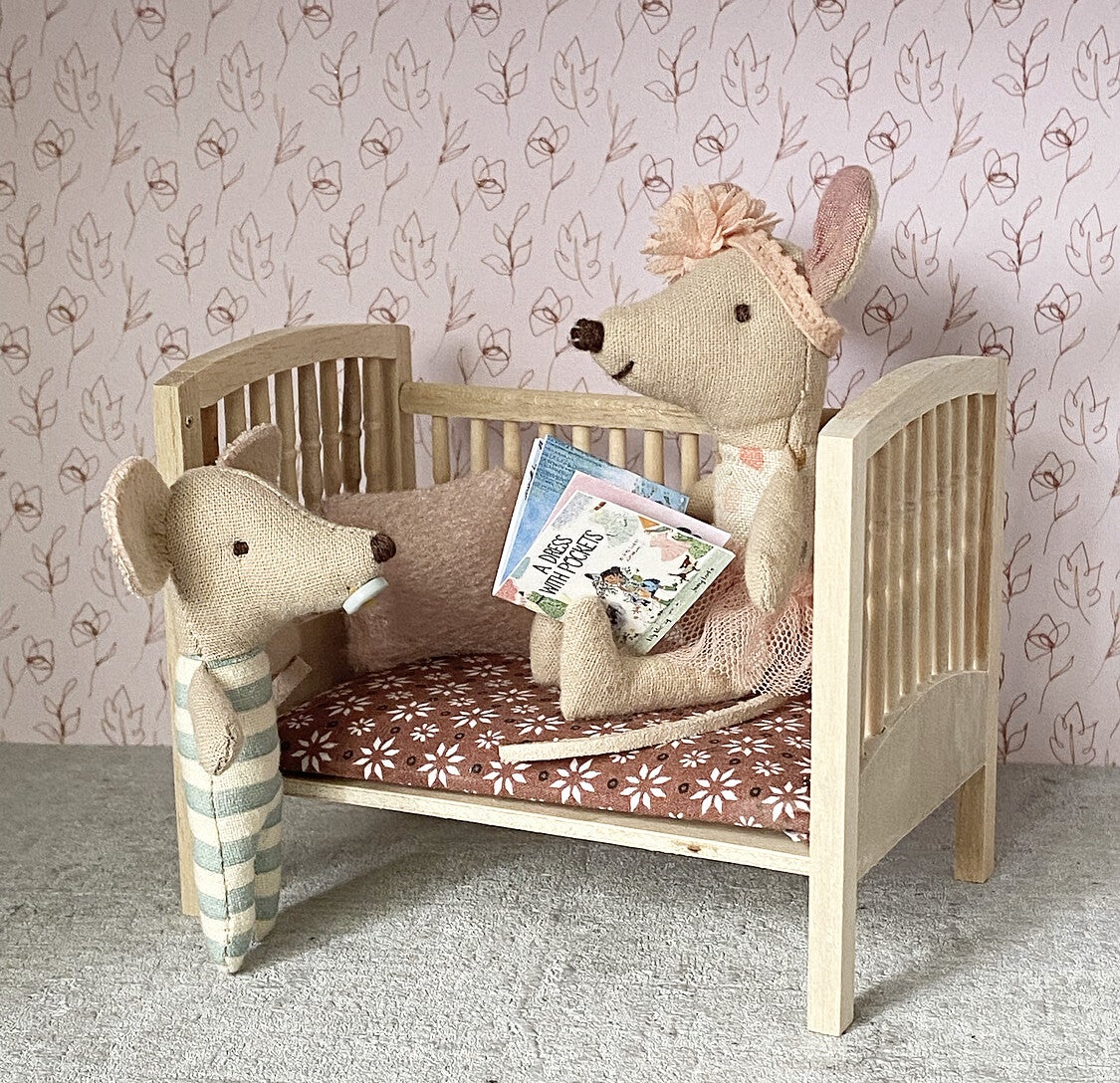 Lief ledikantje met spijlen van blank hout. De zijkant kun je er eenvoudig uithalen zodat je hem ook als bankje kunt gebruiken. De baby Maileg muisjes passen perfect in het bedje. Inclusief matrasje.