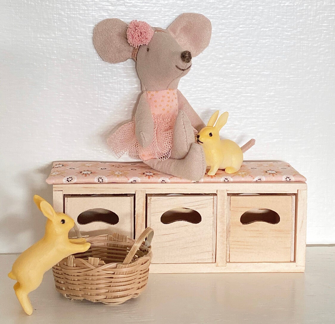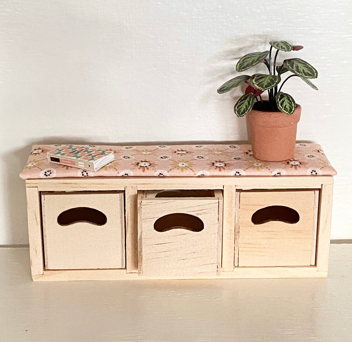 Multifunctioneel bankje van blank hout met 3 opbergvakjes. Met een leuk kussentje erop geef je hem gelijk een heel eigen stijl. Wanneer je hem rechtop neerzet is het een heel mooi kastje.