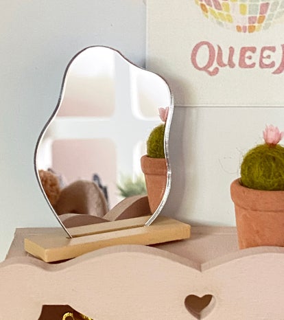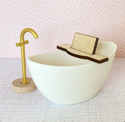 Bad van kunststof, komt compleet met plankje en kraan (zonder getoonde accessoires). Op het plankje kun je bijvoorbeeld een boek en badbenodigdheden zetten. De kraan is goudkleurig. Dit bad past ook heel goed in een wat kleiner poppenhuis en is goed te combineren met Maileg. Op de foto zit het little sister muisje van Maileg erin.
