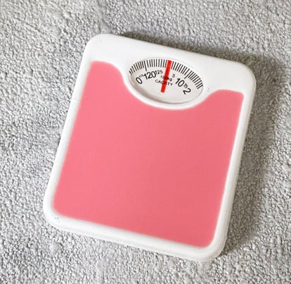 Kleine wit met roze weegschaal voor in de badkamer van je poppenhuis.