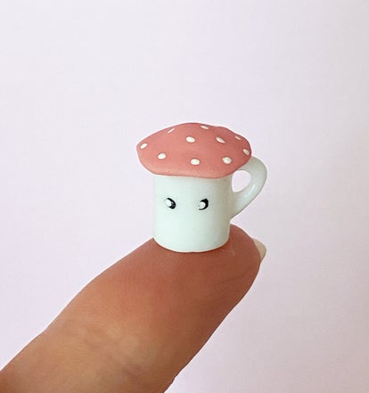Kleine witte mok met een roze paddenstoel hoedje. Het hoedje kan er af. De mokjes zijn per stuk verkrijgbaar en kunnen onderling iets van elkaar verschillen omdat het handgemaakt is.