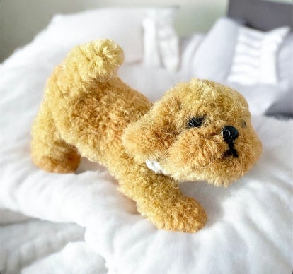 Dit lieve kleine hondje is handgemaakt door mij. Je kunt hem voorzichtig in verschillende posities laten staan of zitten. Echt heel schattig om zo'n klein vriendje in je poppenhuis te zetten. Qua afmetingen past het hondje heel goed bij de kleine Maileg muisjes. Hondenbedjes en voerbakjes zijn apart verkrijgbaar.