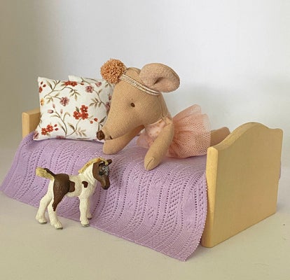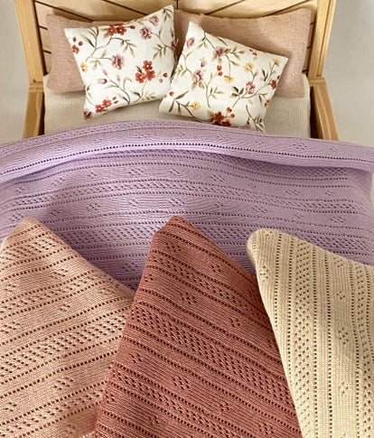 Mooie soepel vallende deken van tricot met ajour print. Verkrijgbaar in 4 kleuren. Niet alleen leuk voor op je poppenhuis bedje maar ook heel mooi als plaid op een stoel of bank. Afmetingen zijn 14 x 16cm.