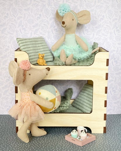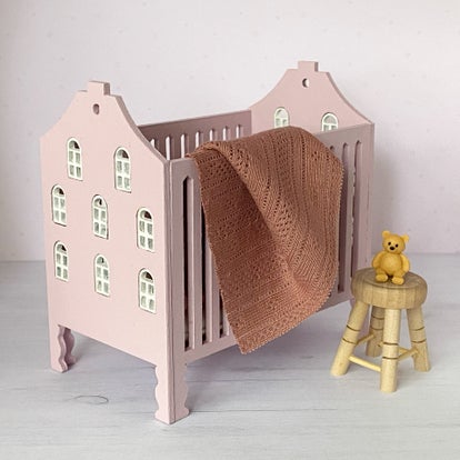 Dit lieve stapelbed is echt een plaatje voor in de kinderkamer van je poppenhuis. Het is ontworpen en gemaakt door Handmade Timber Tales die echt hele schattige poppenhuis meubeltjes maakt. Het komt compleet met twee handgemaakte matrasjes, twee kussentjes en twee dekentjes. Verkrijgbaar als diy pakket waarbij je het bedje zelf eenvoudig in elkaar kunt lijmen of kant en klaar in elkaar gezet door mij.