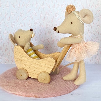 Kleine houten wandelwagen voor in het poppenhuis. Baby Maileg muis past erin.