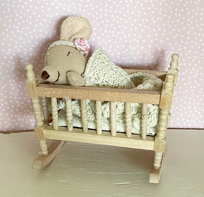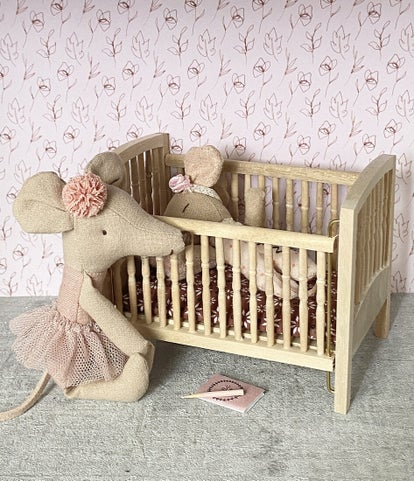 Lief wiegje voor in het poppenhuis. De baby Maileg muisjes passen er perfect in. Materiaal mdf en plastic.