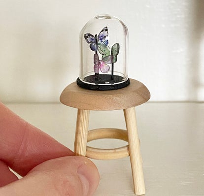 Zo klein en fijntjes deze mooie stolp met vlindertjes. De stolp is van echt glas en is 2.8cm hoog. Hij is verkrijgbaar met verschillende kleuren vlindertjes.